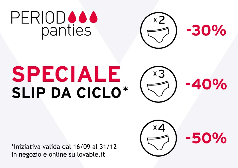 ACQUISTA LE PERIOD PANTIES E PROVA LA NUOVA VESTIBILITÀ E ASSORBENZA DEGLI SLIP DA CICLO PER DONNE E ADOLESCENTI. CON 4 MODELLI A TUA SCELTA, OTTIENI UNO SCONTO DEL -50%!