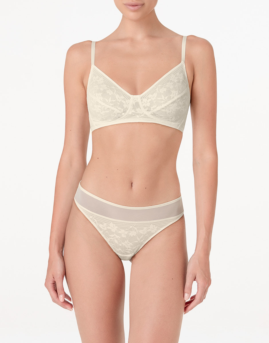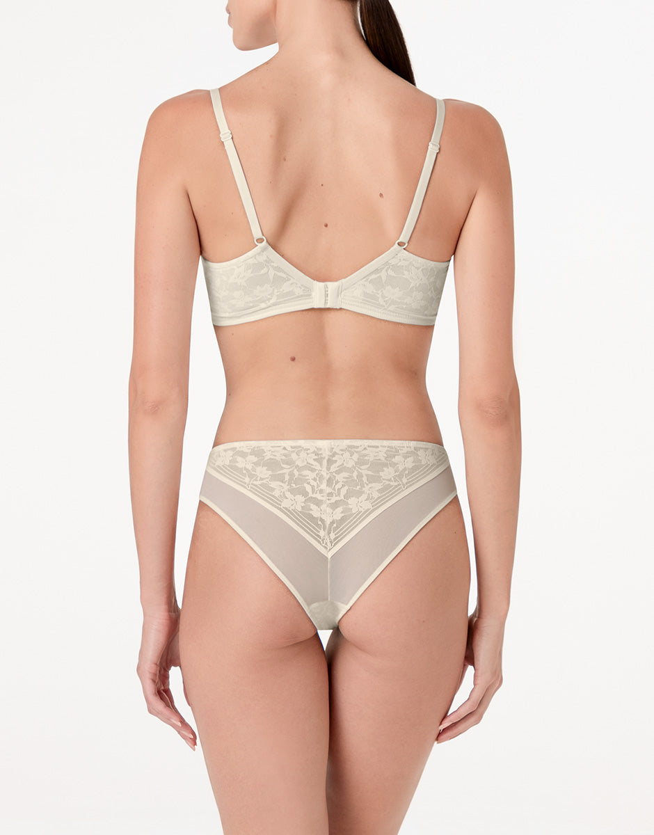 The triangle bra without underwire from the Blossom Lace line in ivory is designed for those who love light, feminine lingerie with attention to detail. Floral lace is combined with tulle to create a delicate play of transparencies that naturally enhances the décolleté.