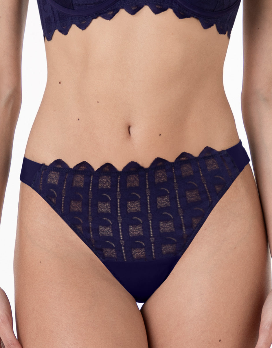 Il colore viola scuro intensifica il carattere del pizzo e dona profondità al design, rendendo questo brasiliano ideale per un look intimo deciso, femminile e contemporaneo.