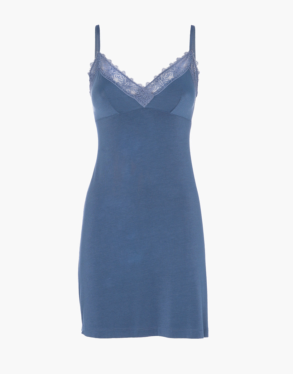 The Elegant Modal women's slip in powder blue is made from soft stretch modal and is designed to feel light and soft against the skin, combining comfort and femininity in an essential and refined garment. The flowing line naturally accompanies the body, creating a fluid and pleasant fit, ideal for rest and relaxation. The V-neckline is embellished with delicate lace inserts, which enhance the décolleté with an elegant and harmonious detail. The underbust seams delicately define the silhouette, while the thin adjustable straps allow you to customize the fit. The powder blue color gives the slip a soft and relaxing allure, perfect for those who love an elegant and delicate style even in moments dedicated to themselves.