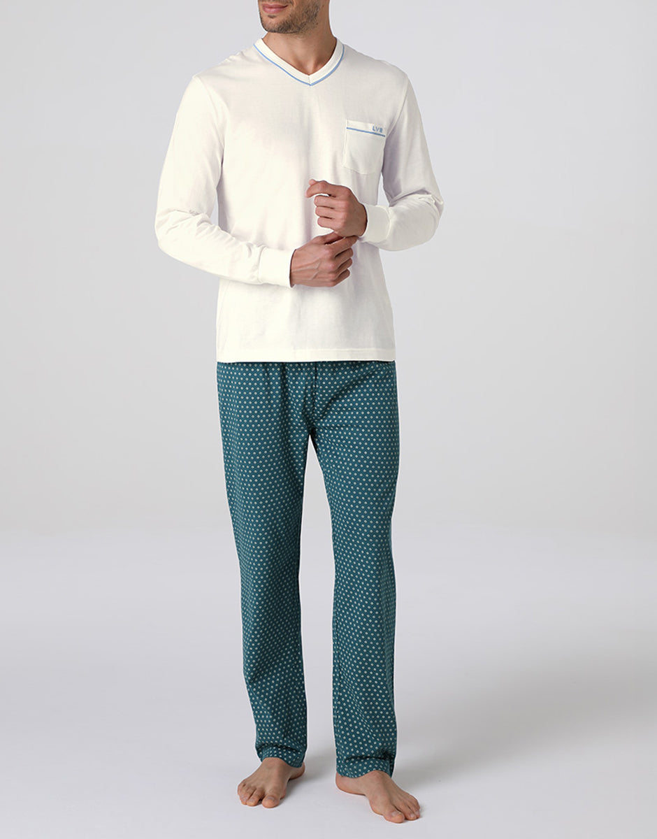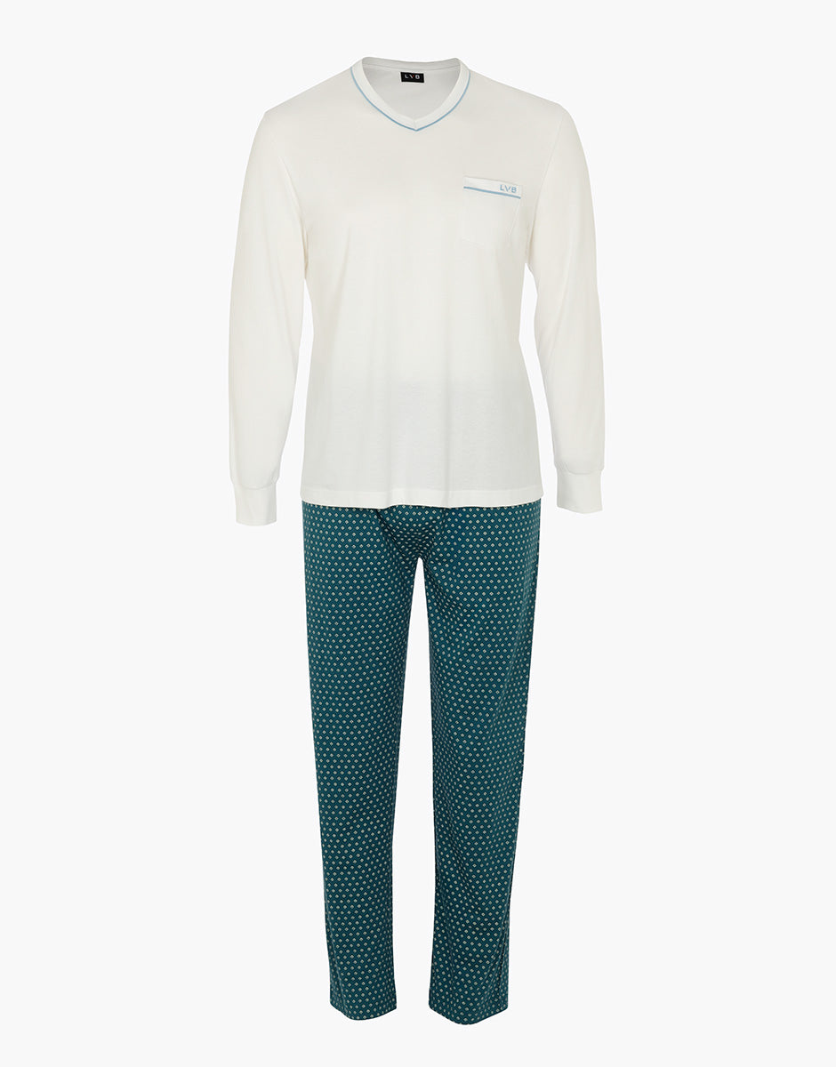 The long-sleeved shirt, in ivory, features a V-neck with contrasting color trim and cuffs on the sleeves. LVB embroidery on the chest adds a simple detail to the garment. The long green printed pants complete the set. The adjustable drawstring waist allows you to adjust the fit, while the patch pocket on the back adds practicality. The LVB embroidery on the sides echoes that of the shirt.