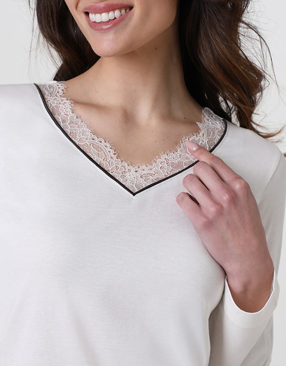 The V-neckline is embellished with a delicate lace ruffle, finished with satin piping that adds a bright and feminine touch, maintaining a clean and harmonious line.