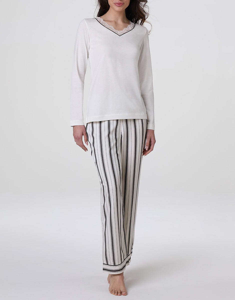 These women's long pajamas are designed to combine natural comfort and refined elegance, ideal for resting in lightness and style. The modal cotton knit, in solid milk white, envelops the skin with a soft and breathable feel, perfect for moments of relaxation.