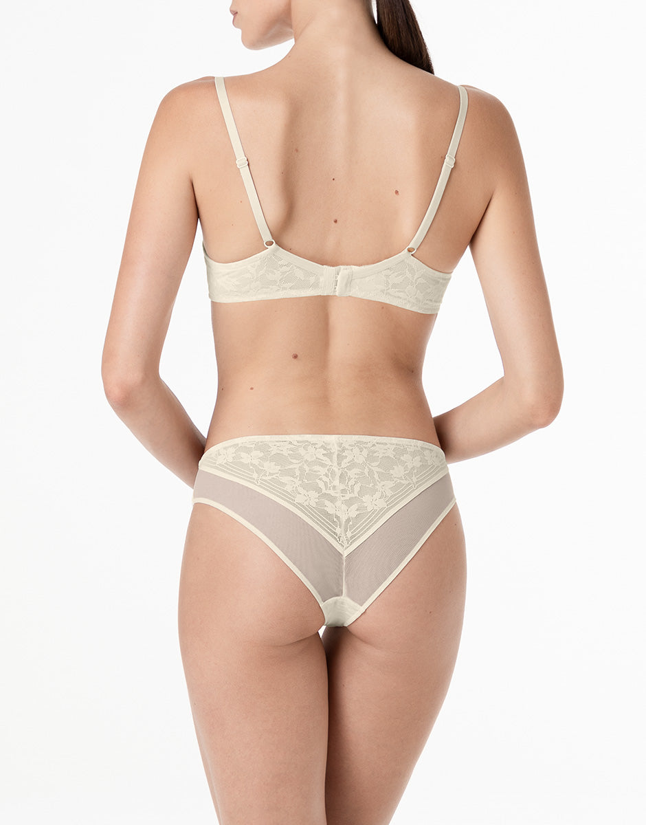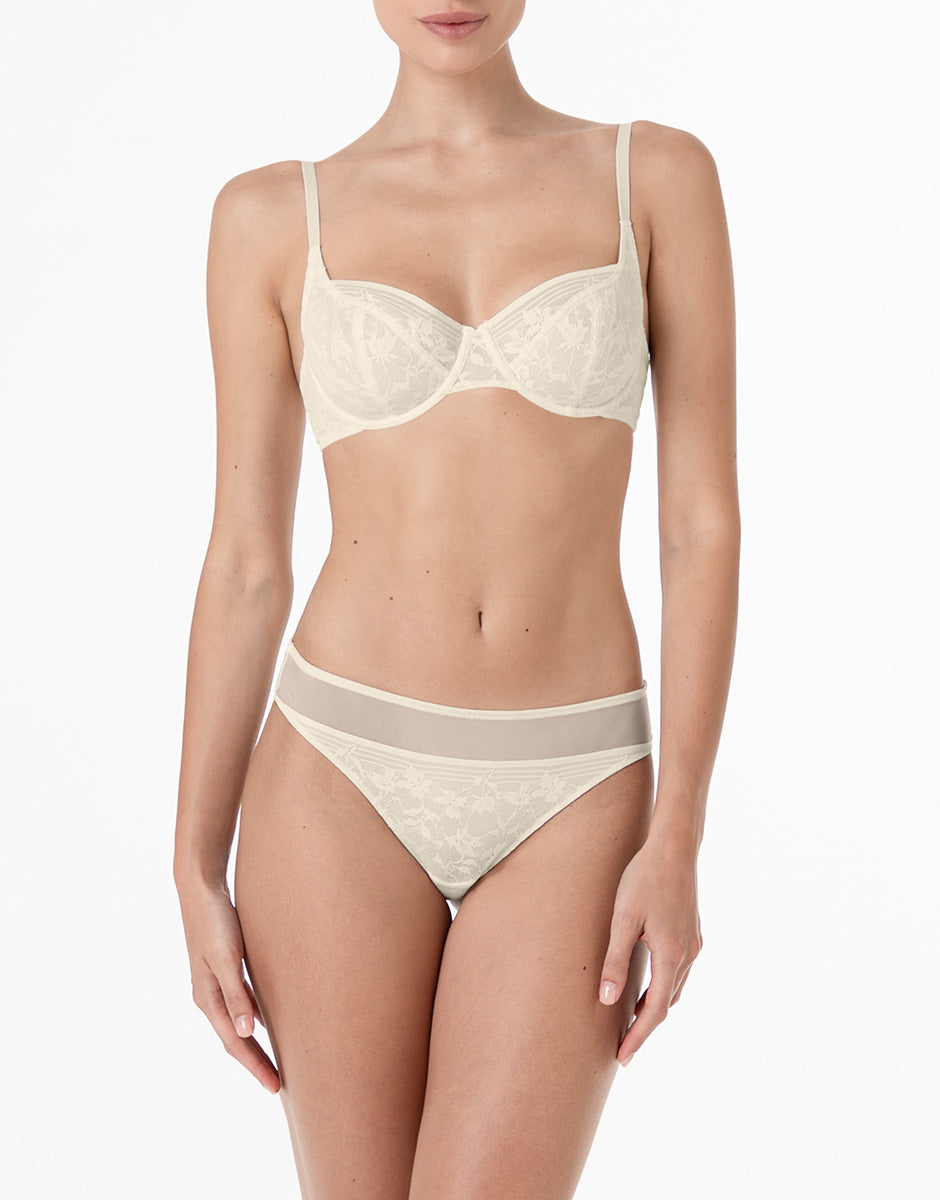 Le coppe a taglio 3, foderate in tulle, accompagnano le forme con delicatezza e definiscono il seno in modo armonioso, mantenendo una linea pulita e curata. Il design è studiato per offrire sostegno visivo e un’estetica equilibrata, perfetta per chi cerca un reggiseno raffinato da indossare ogni giorno.