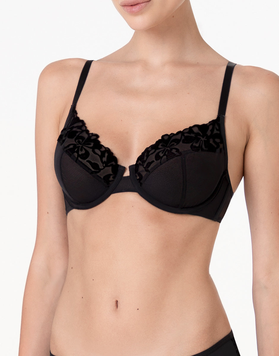 Il colore nero intensifica il carattere elegante del ricamo in velluto, rendendo questo reggiseno perfetto per un’intimità raffinata e femminile.