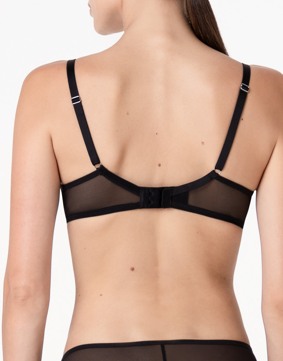 La schiena in tulle completa il design con leggerezza, mantenendo una linea pulita e delicata sulla pelle. Le spalline regolabili permettono di adattare il reggiseno alla propria vestibilità, mentre la chiusura con gancio ad occhiello assicura una regolazione pratica e sicura.