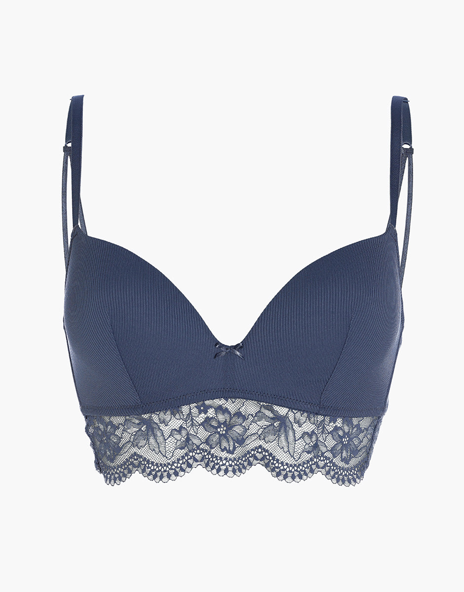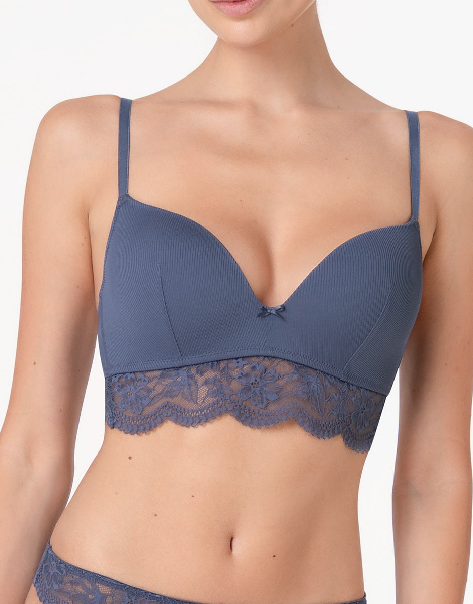 Reggiseno senza ferretto imbottito Casual Rib Lace in microfibra e pizzo, blu polvere