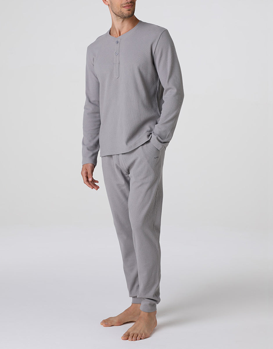 These men's long waffle fabric pajamas feel great against the skin and are ideal for relaxing. The special waffle weave makes the fabric lightweight and breathable, perfect for wearing in mid-seasons.