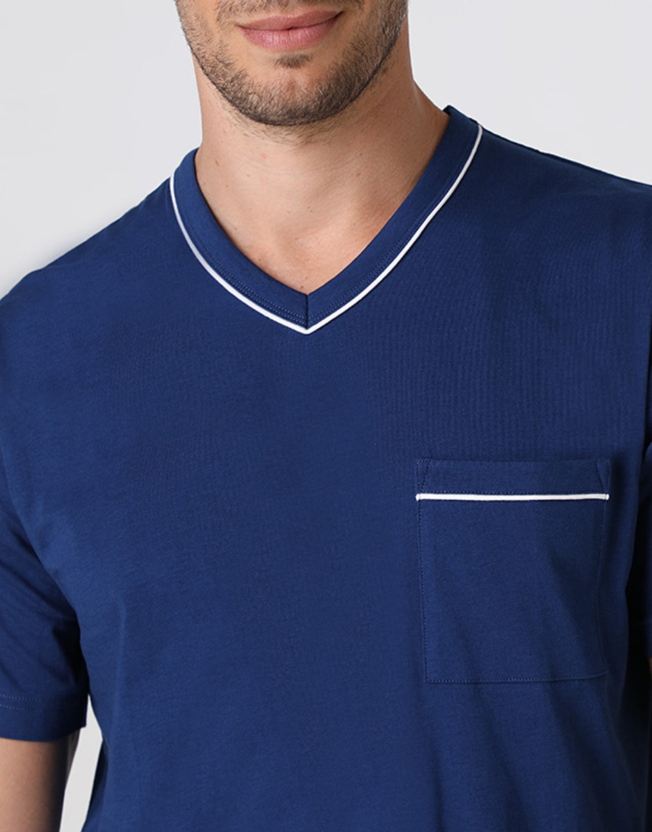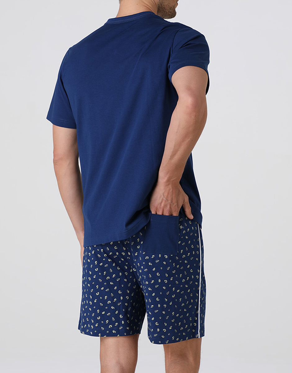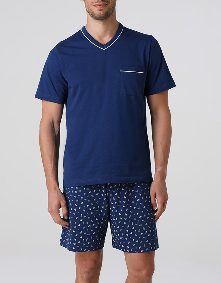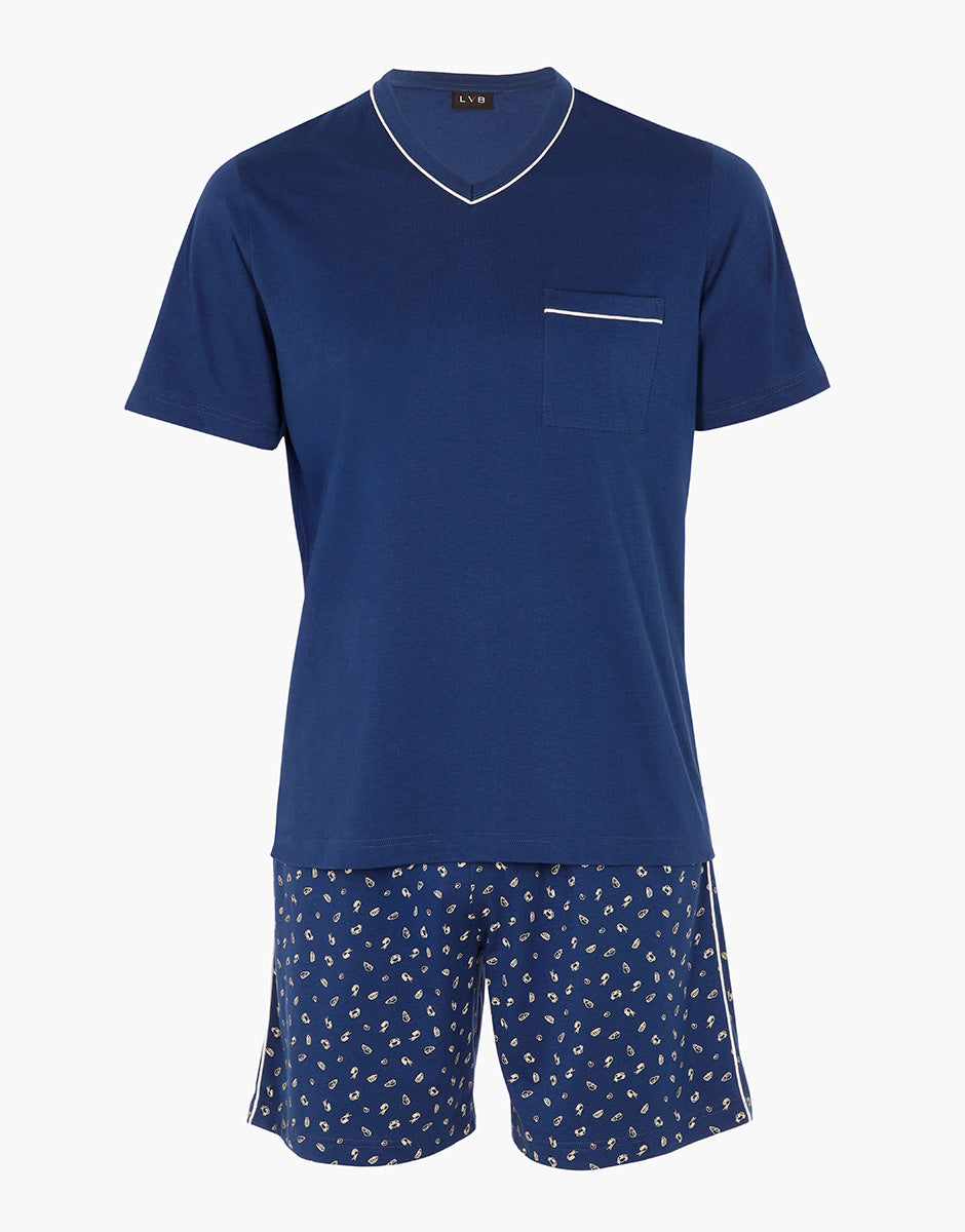 These men's jersey pajama shorts are ideal for warmer nights and relaxing at home. The cotton fabric is soft and breathable, designed to feel pleasant against the skin while you rest. The midnight blue short-sleeved T-shirt features a V-neck trimmed with contrasting piping. The patch pocket on the chest, with LVB embroidery and matching piping, adds a graphic detail that characterizes the model with simplicity. The printed shorts complete the set with a comfortable and lightweight fit. They feature a contrasting drawstring at the waist and matching piping on the sides. On the back, the solid-color patch pocket with contrasting piping echoes the details of the shirt, maintaining consistency throughout the set. A cool and practical pajama set, ideal for comfortable summer rest.