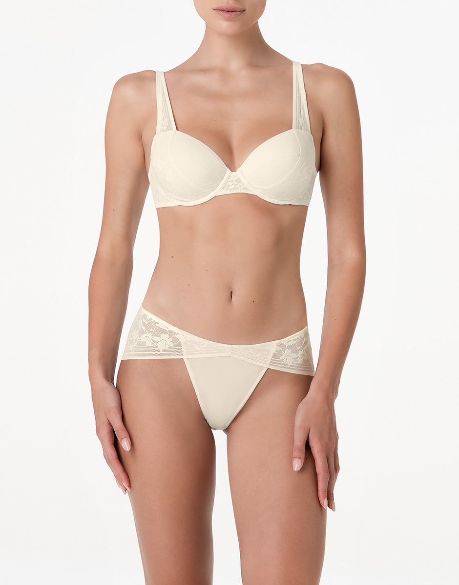 Il pizzo floreale, elemento distintivo della linea, si unisce al tulle leggero per un effetto visivo armonioso e luminoso, ideale per chi ama un’intimità curata nei dettagli ma dall’allure delicata. La linea è studiata per accompagnare le forme senza costrizioni, offrendo una vestibilità femminile e confortevole in ogni momento della giornata.