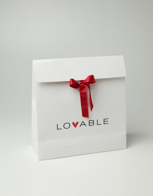 La Gift Box Grande Lovable è pensata per regali più voluminosi, come pigiameria o set di abbigliamento intimo più grandi. Realizzata in carta materica color gesso di alta qualità, con dettagli come il nastro in raso rosso, il logo sul fronte e il cuore sul retro, rende ogni regalo speciale e curato.