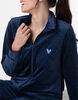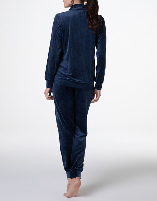 Concediti il massimo comfort con questo homewear aperto in morbida ciniglia, perfetto per i momenti di relax in casa ma abbastanza versatile da essere indossato anche all’esterno. La casacca, in un elegante blu notte, è dotata di una pratica chiusura con zip e di un delicato ricamo a forma di cuore sul petto laterale in tono azzurro, che aggiunge un tocco di dolcezza e stile. Le tasche a filetto e i polsini rifiniti completano il design, garantendo comodità e praticità in ogni movimento.