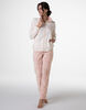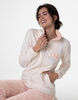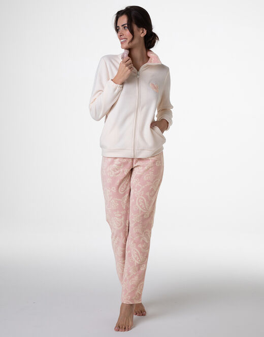 I pantaloni rosa con fantasia avorio completano il look con morbidezza e stile, offrendo una vestibilità comoda sulla pelle. Un completo pensato per unire calore, praticità e un tocco di dolcezza in casa.