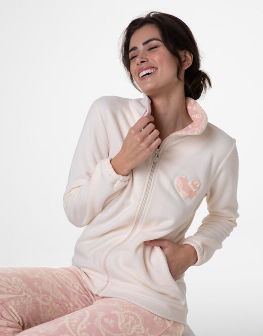 Un completo homewear morbido e confortevole, ideale per rilassarsi a casa nelle giornate più fresche. La casacca aperta in micropile avorio è arricchita da dettagli femminili, come cursore a forma di cuore sulla zip, patch e ricami laterali a cuore. L’interno del collo richiama il colore rosa del pantalone, creando un coordinamento delicato e armonioso. Le tasche a filetto e il fondo manica leggermente arricciato assicurano praticità e comfort.