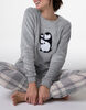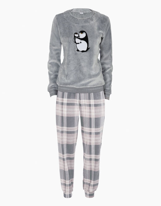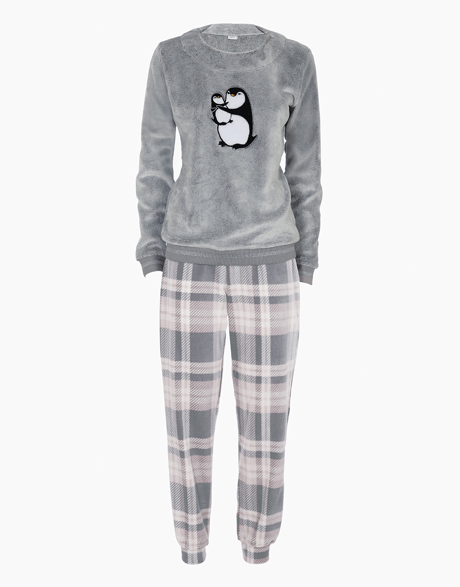 Un homewear lungo da donna caldo e avvolgente, ideale per i momenti di relax a casa nelle giornate più fredde. La casacca in morbida pelliccetta grigio melange è arricchita da un patch con simpatici pinguini, per un tocco femminile e divertente. I polsini e il fondo casacca sono rifiniti in costina con dettaglio lurex, che dona luminosità e stile.