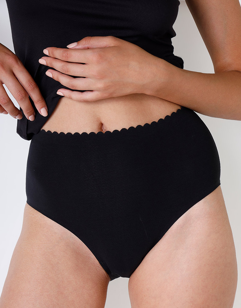 - Assenza di bordi elastici sul girovita e girogambe con finitura taglio a vivo e rinforzo adesivato
