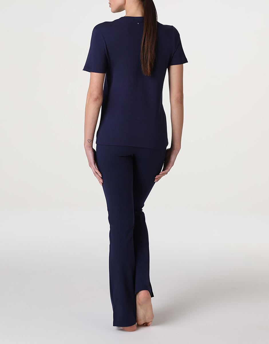 I pantaloni a zampa della linea Active Comfort, nel raffinato colore blu notte, offrono comfort e libertà di movimento, ideali per l’attività fisica e il tempo libero.