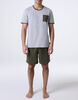 Il design è valorizzato da bordi a contrasto in verde oliva sul collo e sulle maniche, coordinati al pantaloncino corto verde oliva tono su tono, dotato di coulisse regolabile e tasca patch posteriore funzionale e ben rifinita. Il taschino sulla casacca, anch’esso in verde oliva, aggiunge un tocco distintivo al capo.