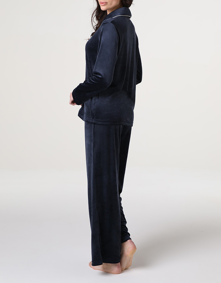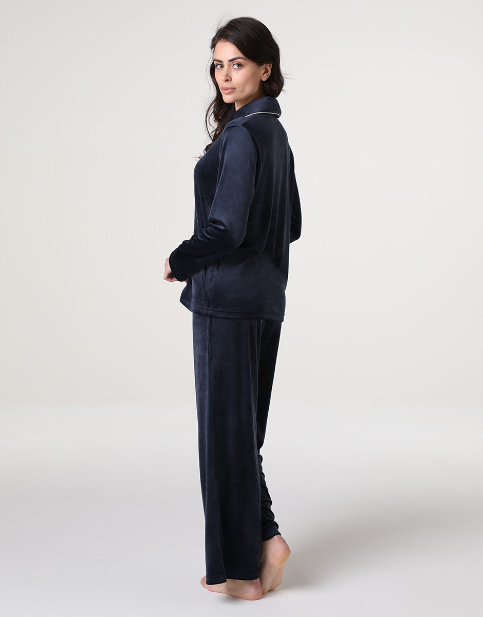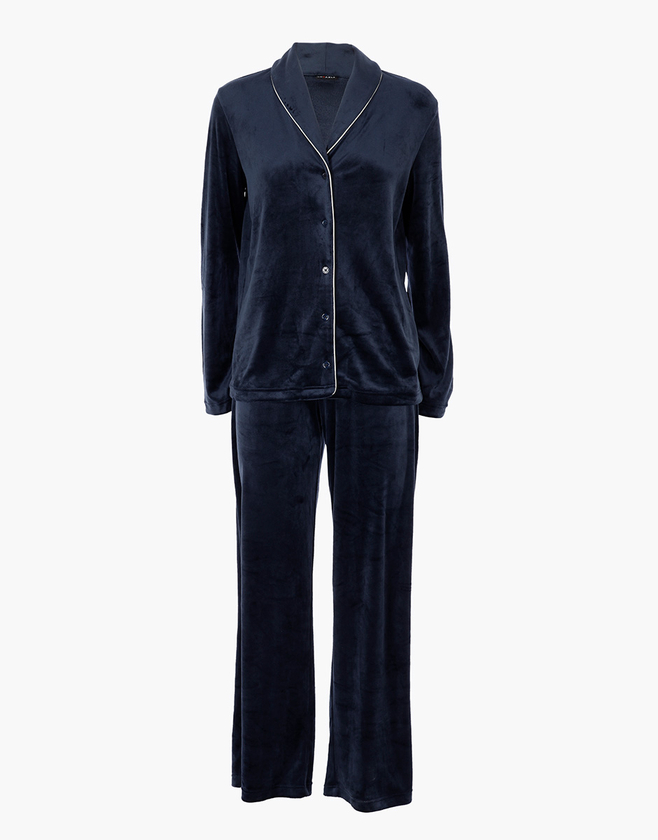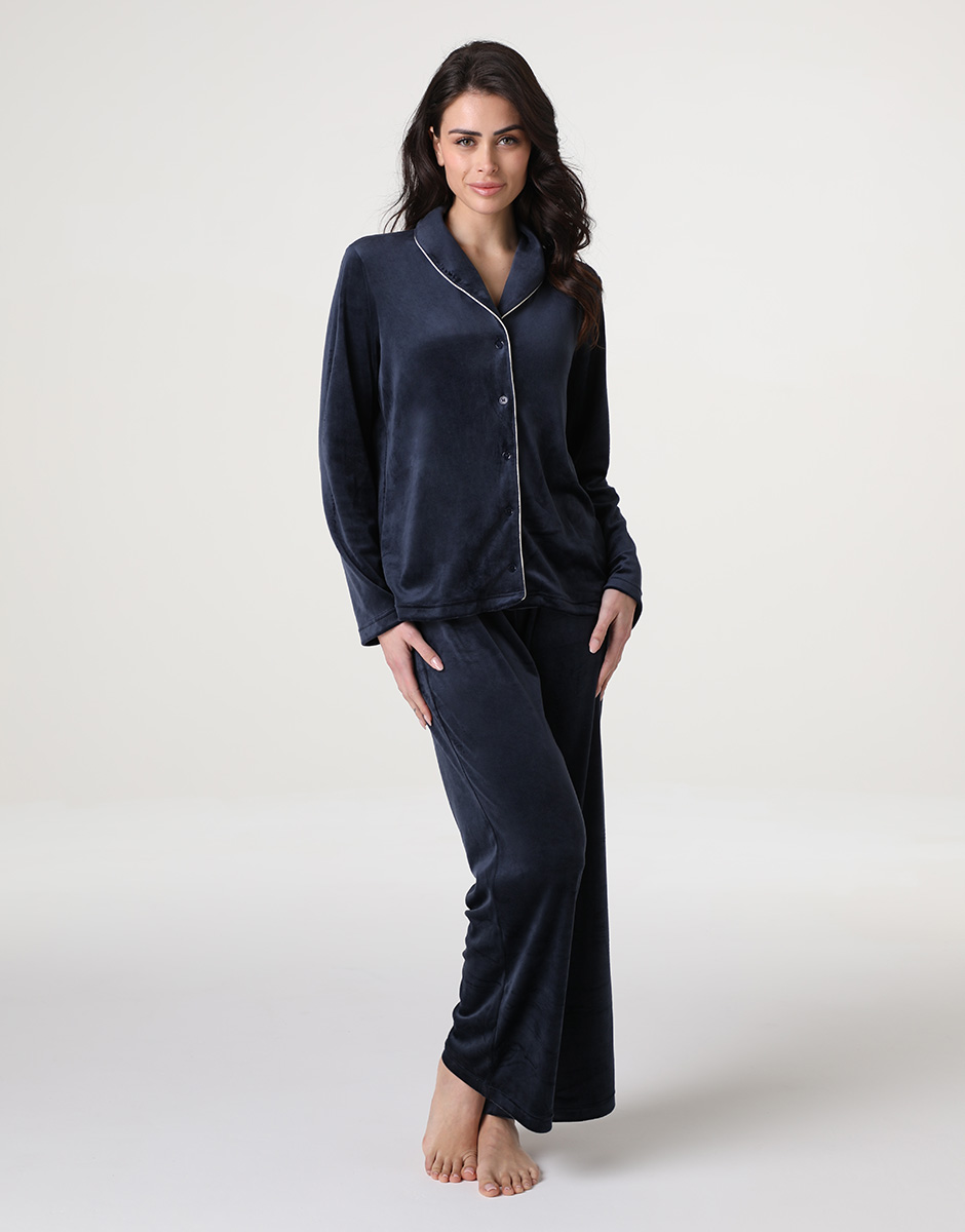 Un pigiama lungo da donna elegante e confortevole, realizzato in morbida ciniglia dal leggero effetto lucido. Il colore blu notte regala al capo un aspetto raffinato e senza tempo, perfetto per accompagnare le tue serate di relax con un tocco di stile.