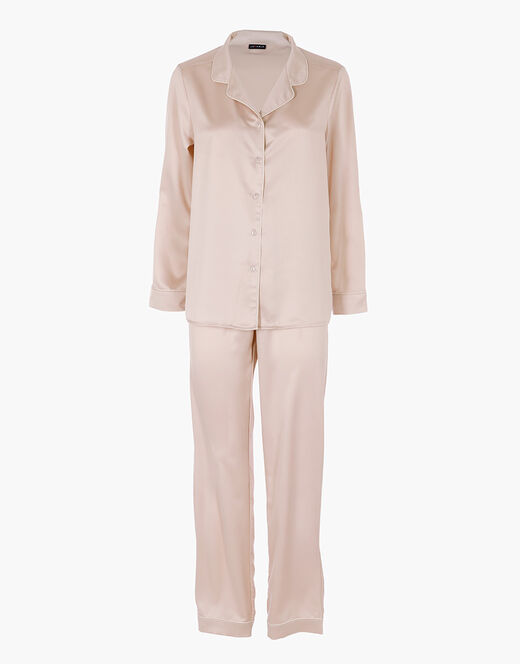 Un pigiama lungo da donna elegante e raffinato, pensato per offrire comfort e morbidezza durante le serate a casa. Realizzato in satin effetto opaco rosa champagne, avvolge delicatamente il corpo e valorizza la femminilità in ogni dettaglio.