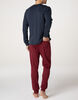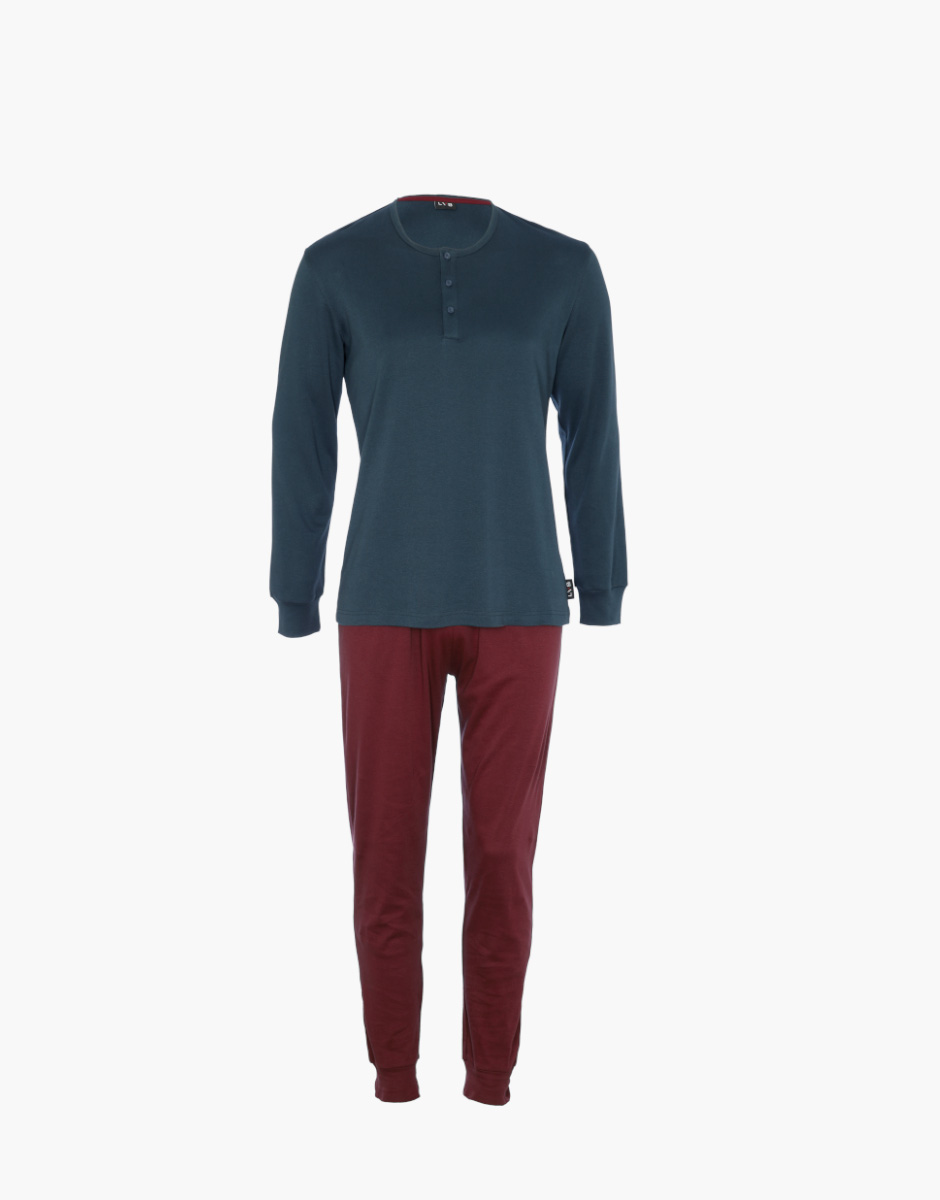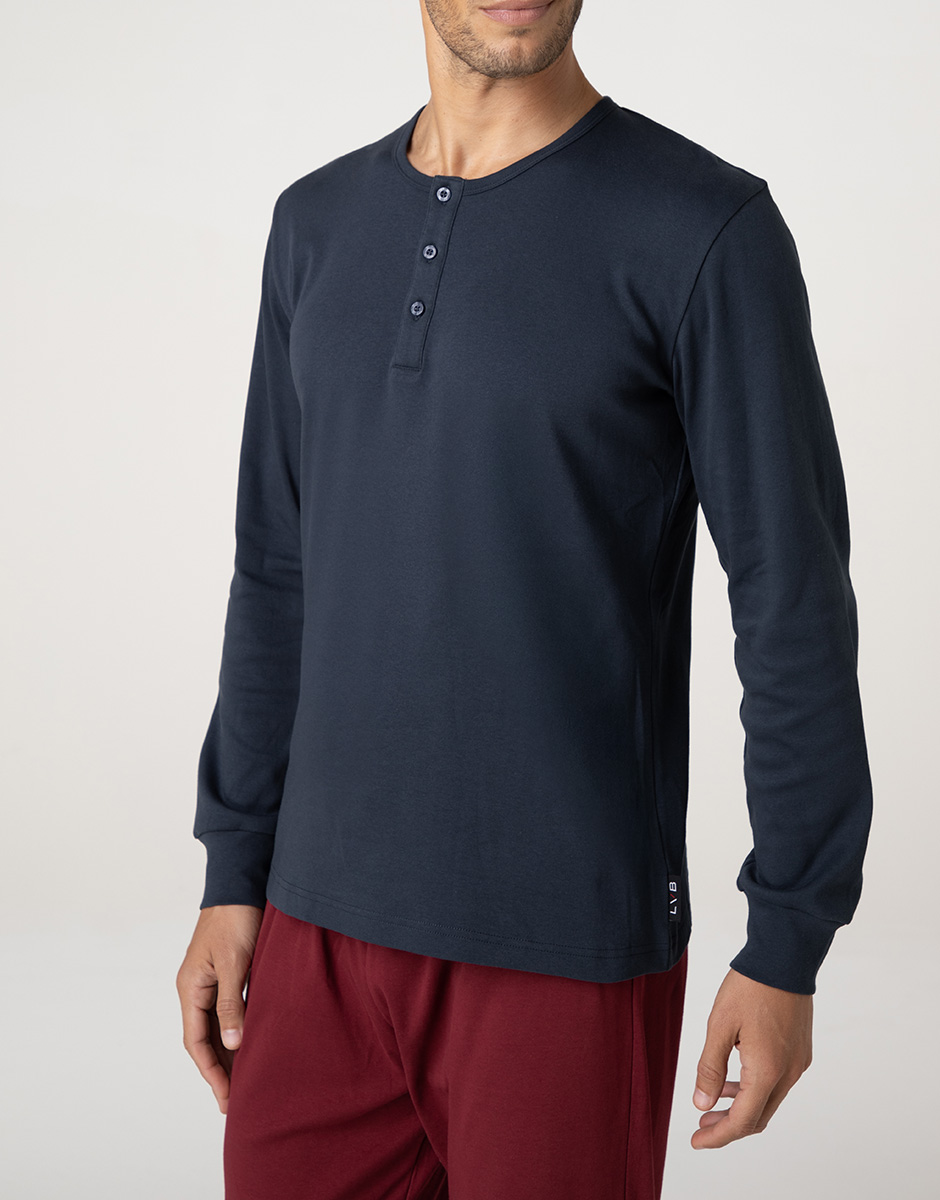 Un pigiama lungo da uomo realizzato in morbido cotone interlock, che assicura comfort e calore naturale durante la notte. La casacca blu notte presenta un collo serafino a 3 bottoni e polsini al fondo manica, per una vestibilità comoda.