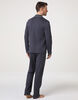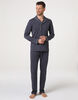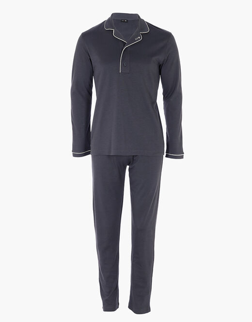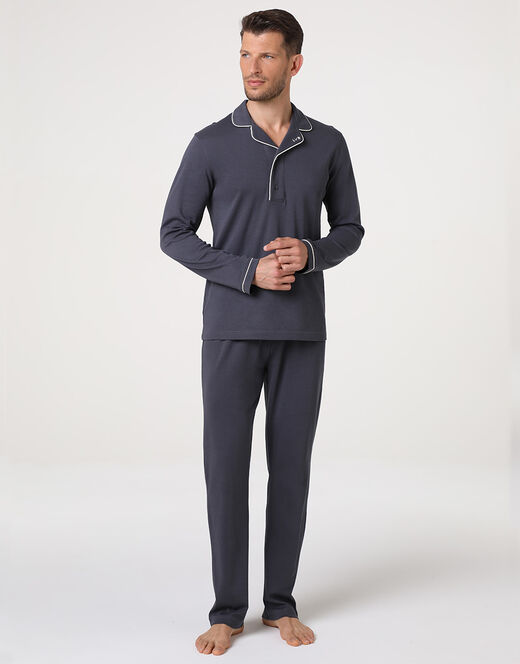 Un pigiama lungo da uomo in elegante colore ebano che unisce comfort e stile raffinato, perfetto per il relax a casa. La casacca presenta un collo serafino con revers, valorizzato da piping a contrasto color avorio sul collo e sui polsini delle maniche, per un dettaglio discreto ma distintivo. Sul revers spicca inoltre un piccolo logo ricamato a contrasto, che completa il look con eleganza.