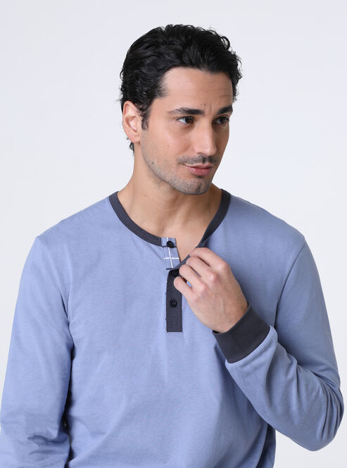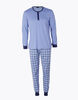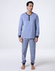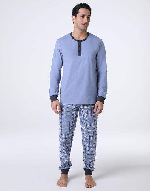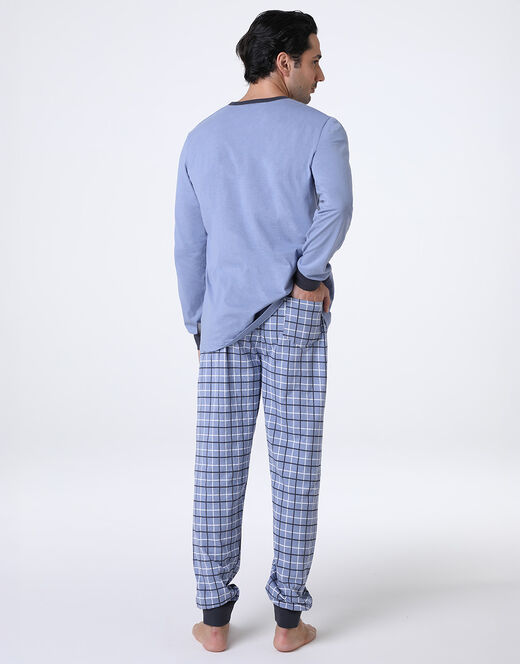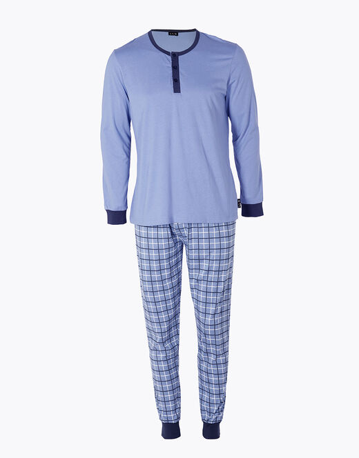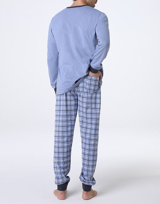 Scopri il comfort del pigiama lungo in jersey di puro cotone, pensato per i tuoi momenti di relax. La casacca a manica lunga, in tinta unita color avio, è caratterizzata da uno scollo serafino con apertura a tre bottoni e interno in tessuto stampato, lo stesso motivo che decora il pantalone per un abbinamento armonioso. Il bordo del girocollo e i polsini sono realizzati in contrasto blu, aggiungendo un tocco essenziale al design.
