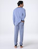 Il pantalone lungo, in tonalità avio con stampa check allover, è dotato di coulisse regolabile a contrasto e di una tasca applicata sul retro. I polsini in colore blu richiamano quelli della casacca, completando il look con coerenza.