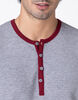 Scopri il nostro pigiama lungo da uomo con collo serafino, realizzato in Warm Fabric per la casacca e in interlock per il pantalone, nei raffinati colori grigio melange e bordeaux. La casacca grigio melange presenta un elegante collo serafino a 4 bottoni a contrasto, mentre i pantaloni bordeaux con coulisse regolabile e tasca patch sul retro completano il design, unendo stile e funzionalità.