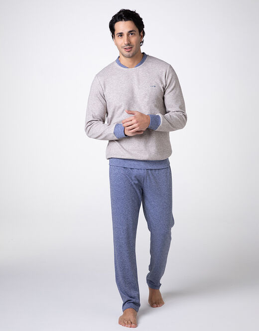 Scopri il nostro pigiama lungo da uomo in interlock caldo e morbido, color beige melange con dettagli azzurro melange. Realizzato in un tessuto tecnico che unisce poliamide, viscosa ed elastan, garantisce elasticità, calore e traspirabilità per un comfort eccezionale durante le tue serate di relax.