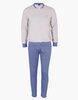 La casacca girocollo è arricchita da polsini, bordo girocollo e fascia su fondo casacca a contrasto azzurro melange, mentre il pantalone abbina lo stesso colore con coulisse regolabile e tasca patch a contrasto. Il ricamo discreto sul petto laterale completa il design con un tocco di eleganza raffinata.