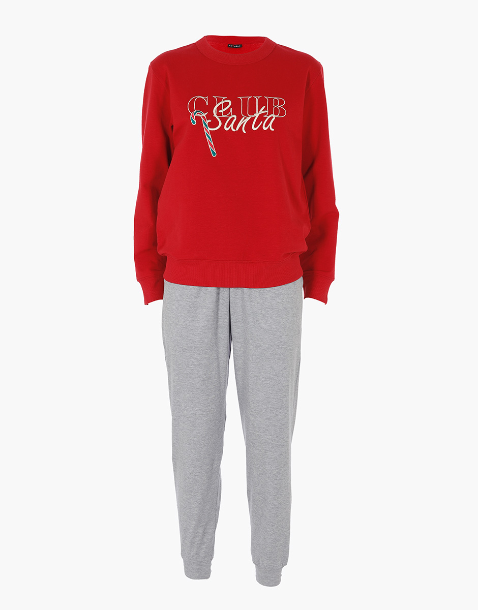 Il pantalone in contrasto grigio melange completa il look con semplicità e stile, ed è rifinito con polsini sul fondo per garantire comodità durante il riposo. Un completo versatile, pensato per unire calore e comfort con un design curato nei particolari.