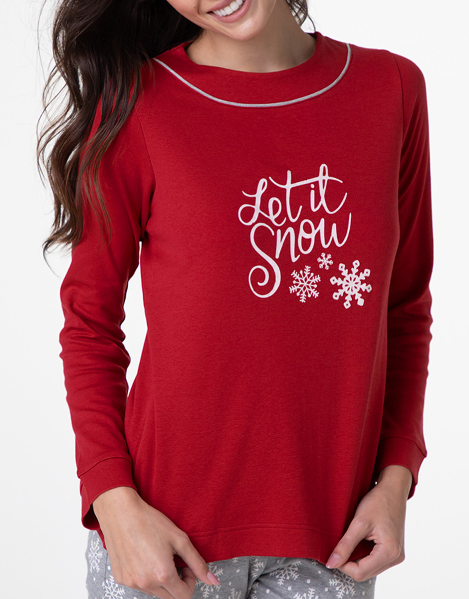 Un pigiama lungo da donna pensato per offrire comfort e calore durante le serate più fredde. La casacca girocollo in interlock rosso è arricchita da una stampa piazzata glitter e rifinita con piping a contrasto nel girocollo e polsini sul fondo, per un look curato e femminile.