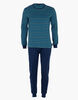 Scopri il comfort e lo stile del pigiama lungo da uomo in interlock di puro cotone, ideale per le tue serate di relax. La casacca a righe verde è realizzata in tessuto tinto filo e presenta girocollo e polsini coordinati, abbinati ai pantaloni tinta unita blu con coulisse regolabile e tasca patch posteriore stampata, in perfetta armonia con la casacca.