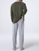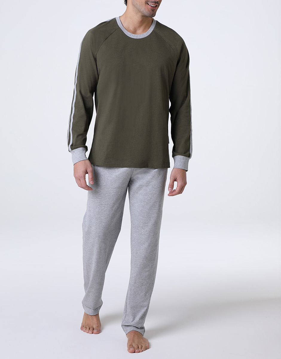 Scopri il comfort del pigiama lungo in cotone verde oliva, ideale per le tue serate di relax. La casacca girocollo è caratterizzata da maniche raglan con bande a contrasto grigio melange, abbinate al bordatore sul collo e sui polsini, per un look più casual e sportivo. Il pantalone grigio melange, morbido e leggero, presenta una tasca patch posteriore tono su tono, per un tocco pratico.