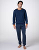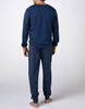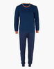 Concediti il massimo comfort con questo pigiama lungo da uomo in interlock, perfetto per le serate e le notti di relax. La casacca tinta unita blu navy è arricchita da dettagli a contrasto color cognac sul bordo girocollo e sui polsini, che conferiscono un tocco di stile raffinato e moderno.