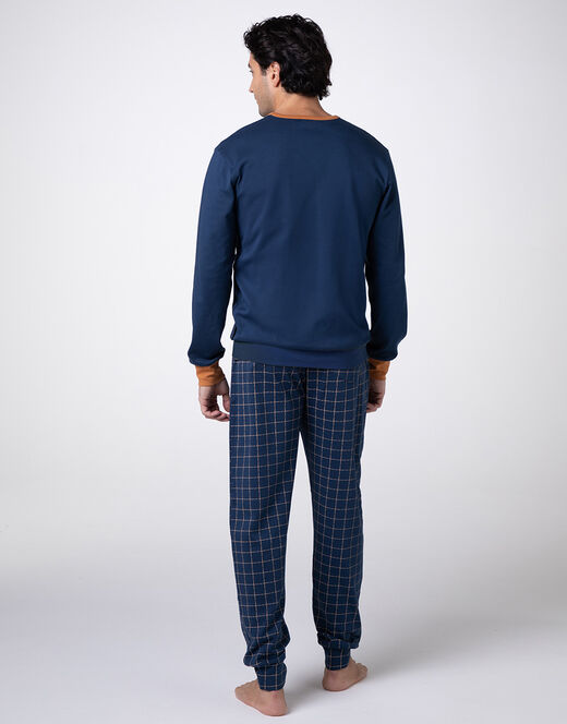 I pantaloni, sempre blu navy, presentano una stampa check tono su tono cognac, coordinata ai polsini e alla coulisse a contrasto, per un look elegante e curato nei dettagli. La vestibilità è studiata per offrire comodità e libertà di movimento, mentre il tessuto naturale assicura morbidezza e traspirabilità durante il riposo.