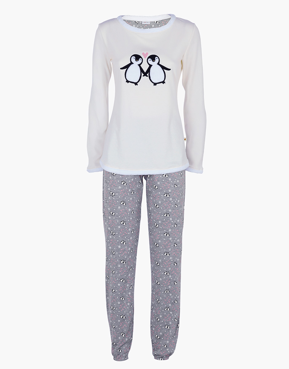 Un pigiama lungo da donna caldo e morbido, perfetto per accompagnare i momenti di relax a casa. La casacca girocollo in interlock color avorio perlato è impreziosita da un patch piazzato con simpatici pinguini, per un tocco femminile e divertente. Girocollo, fondo manica e fondo casacca sono rifiniti in pelliccetta tono su tono, che regala calore e morbidezza.