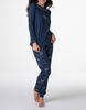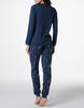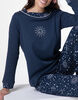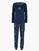 Un pigiama lungo da donna caldo e confortevole, perfetto per rilassarsi con stile a casa. La casacca girocollo in interlock morbido blu navy è decorata con una stampa piazzata sul petto e rifinita con polsini e girocollo coordinati al pantalone, per un look armonioso e femminile.