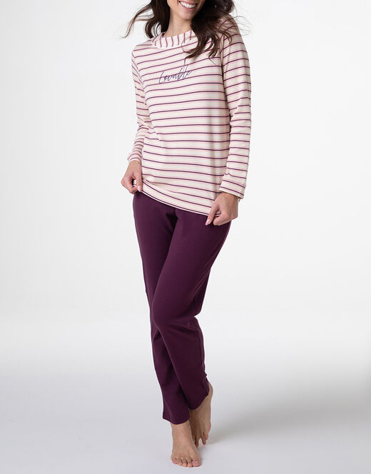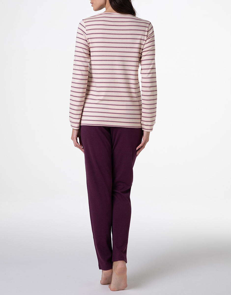 Pigiama Lungo in Interlock, righe avorio, rosa e vinaccia