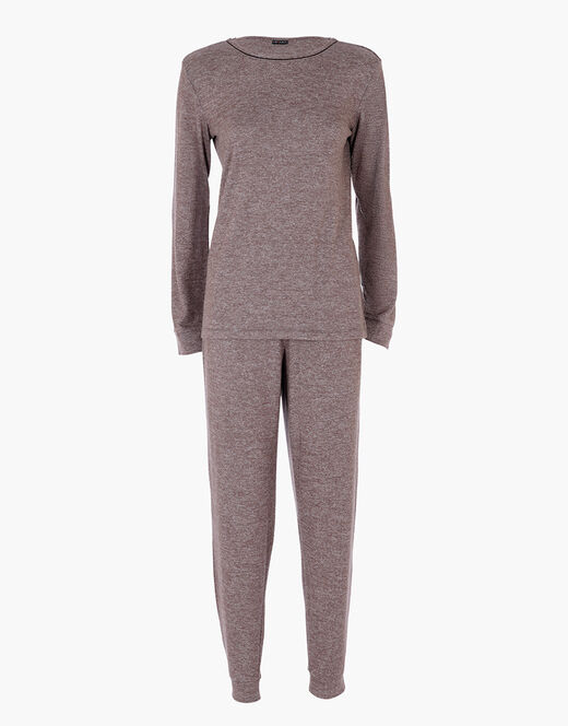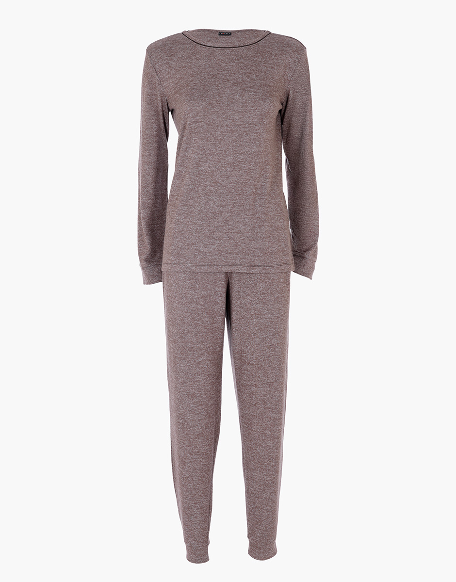 Il modello presenta casacca manica lunga con girocollo e piping in lurex a contrasto, bottoni decorativi sul cavallo, polsini su fondo manica e pantalone e pantalone jogger per una vestibilità moderna e comoda.