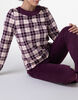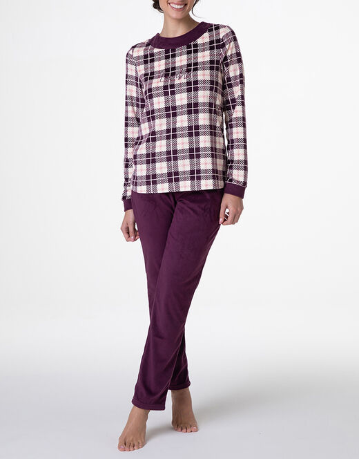 Un pigiama lungo da donna pensato per regalarti calore e comfort durante le notti più fresche. La casacca in morbido micropile presenta un elegante motivo tartan nei toni vinaccia e avorio, arricchito da un delicato ricamo sul petto. Girocollo e polsini a contrasto vinaccia completano il look con un dettaglio curato e coordinato. I pantaloni tinta unita vinaccia, realizzati nello stesso micropile caldo, assicurano morbidezza e vestibilità confortevole, rendendo il pigiama ideale per rilassarsi a casa con stile e comodità.