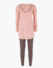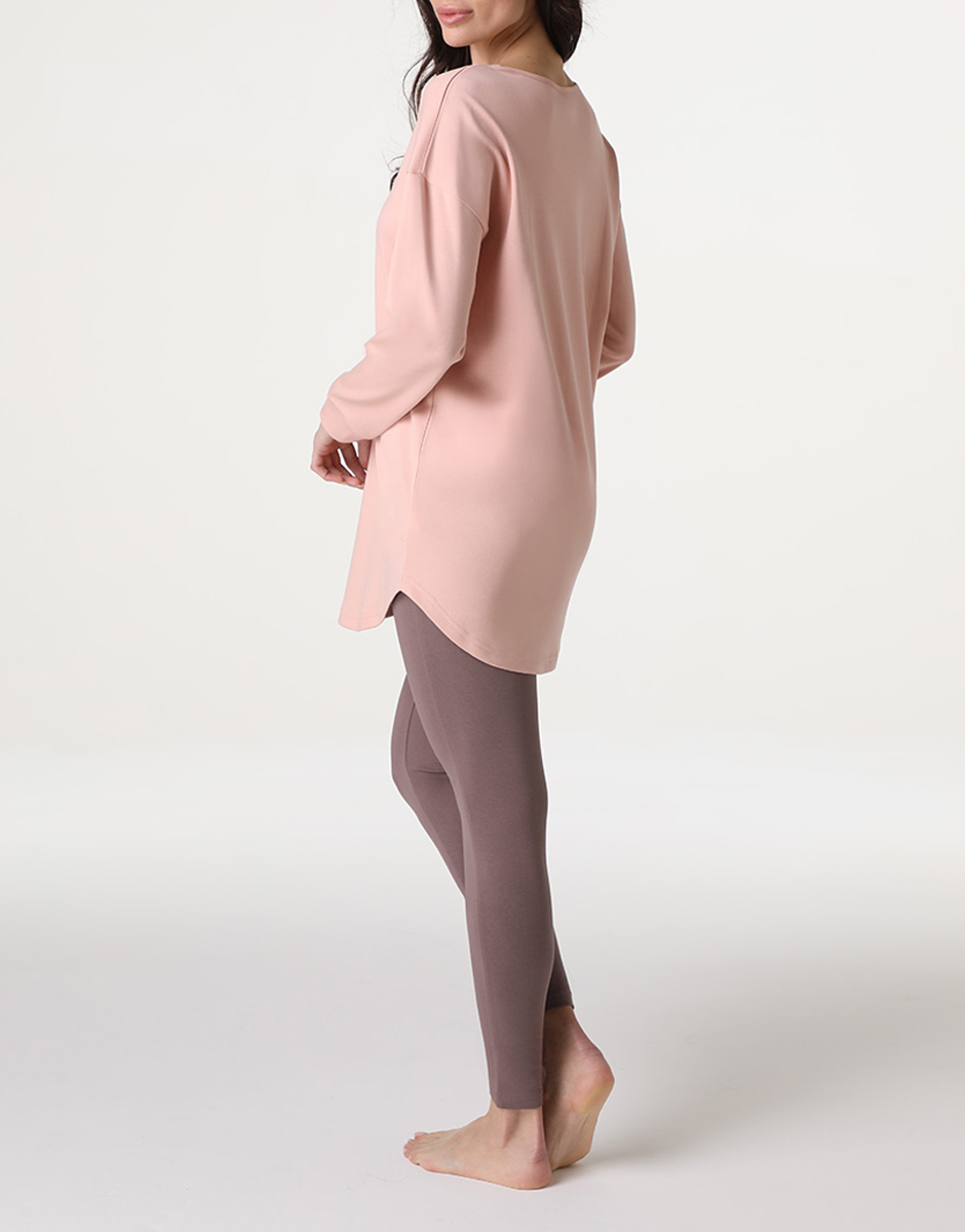 Un pigiama lungo da donna pensato per offrire comfort, morbidezza e praticità durante il relax a casa. La casacca over in interlock rosa blush presenta spalle scese, uno scollo a V con piping a contrasto e polsini sul fondo manica, per un capo femminile e curato nei dettagli. Il fondo stondato sul davanti e sul retro completa il design elegante e moderno.