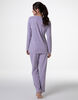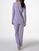 La casacca presenta uno scollo a V, una linea leggermente stondata e più corta sul fronte, con spacchetti laterali che garantiscono libertà di movimento. Il pantalone lungo completa il capo, combinando stile, morbidezza e femminilità in un unico pigiama avvolgente.