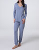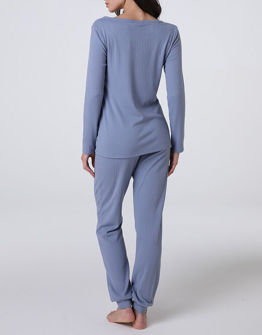 Il pantalone coordinato, con polsini al fondo, offre una vestibilità comoda e piacevole durante il riposo. Il colore avio aggiunge eleganza e sobrietà, rendendo questo completo perfetto per le stagioni più fresche.