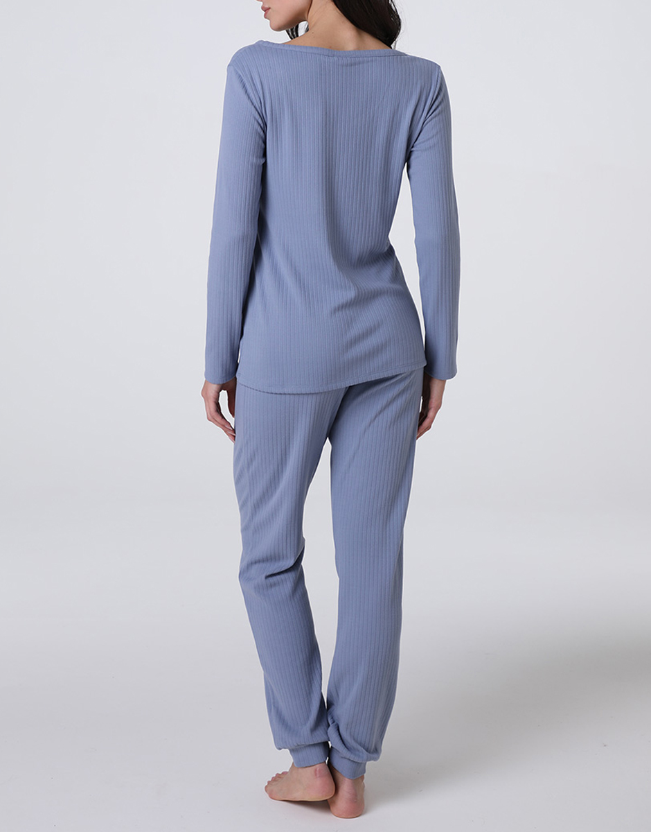 Scopri il comfort di questo pigiama lungo in tessuto a costine, morbido ed elastico, pensato per accompagnare con delicatezza le tue serate in casa. La maglia a manica lunga presenta uno scollo a V con apertura serafino a tre bottoni, ideale per chi cerca praticità senza rinunciare a un tocco femminile.