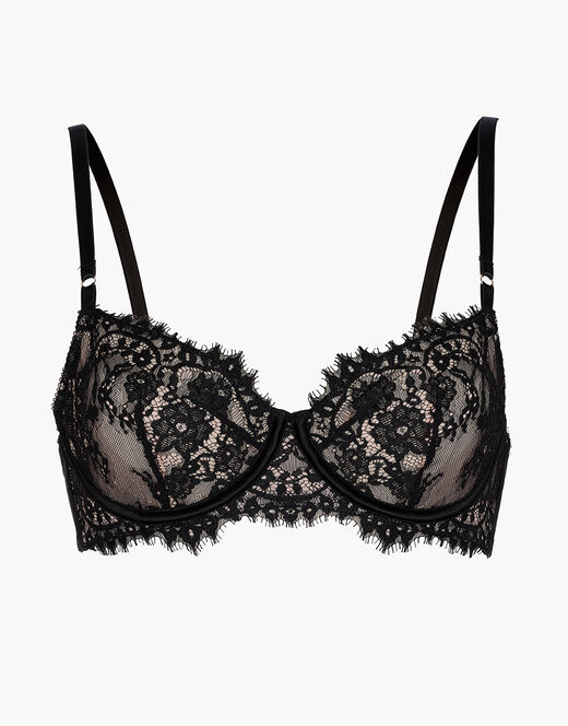 Scopri il reggiseno balconcino con ferretto della serie Le Studio, realizzato in raffinato pizzo nero. Le coppe con cucitura verticale valorizzano il décolleté, mentre il piccolo anello dorato all’apice aggiunge un dettaglio luminoso e ricercato.