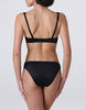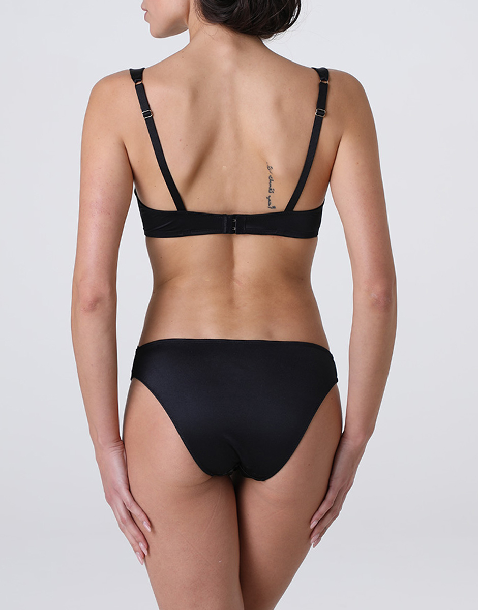 Il triangolo centrale in ricamo, con cucitura centrale, aggiunge un tocco di raffinatezza, mentre le ali posteriori in microfibra satinata garantiscono una calzata perfetta. Le ampie spalline in raso sono impreziosite da un gioiello decorativo all’apice, e gli accessori dorati completano il design con classe.