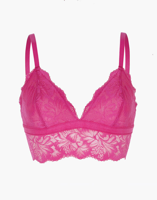 Scopri il reggiseno triangolo della collezione Petal Lace, realizzato in pizzo fucsia luminoso. Le coppe con cucitura verticale e il sottoseno in pizzo modellano delicatamente il décolleté, offrendo comfort e leggerezza senza ferretto. La chiusura a gancio sul retro garantisce una vestibilità sicura e personalizzata, mentre il design semplice ma femminile rende il capo perfetto per chi ama lingerie raffinata ma vivace.