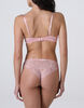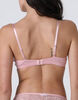 Il pizzo rosa vintage, con delicati motivi floreali circolari, risale dolcemente lungo lo scollo seguendo la linea della coppa vela, per un effetto romantico e sofisticato. Il fiocchetto in raso al centro del seno aggiunge un tocco di dolcezza al design.